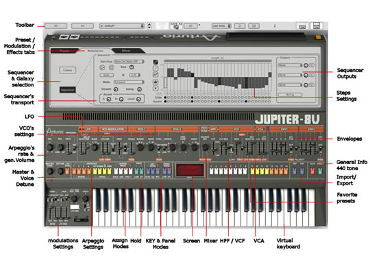 Jupiter 8 è stato un synth che ha ispirato un’intera generazione di musicisti, da Prince a Howard Jones, dai Depeche Mode a Moby, ed è stato anche uno strumento assolutamente unico in grado di fornire suoni chiari e puliti ma anche molto potenti.Con Jupiter-8V Arturia restituisce tutte le sonorità dell’originale aggiungendo nuovissime funzionalità; l’integrazione degli effetti analogici all’interno della linea di sintesi permette modifiche drastiche del suono, mentre il modulo Galaxy, un tool grafico in grado di programmare contemporaneamente due LFO, consente di avere una sorgente di modulazione unica ed innovativa. In aggiunta, con il sequencer, è possibile creare nuove linee melodiche con estrema semplicità.Jupiter 8 V rappresenta una soluzione “all in one” e costituisce una perfetta integrazione tra storia e tecnologia. La palette di suoni è moderna e completa, per uno strumento che ha influenzato intere generazioni di musicisti.Caratteristiche principali:• Più di 400 preset di altissimo livello di qualità e innovazione• Fino a 32 voci di polifonia con possibilità di unisono• Una struttura audio unica con 2 oscillatori per voce, 2 LFO, 2 filtri e 2 inviluppi.• Keyboard split e layer• Un set di effetti “Analog Sounding” disponibili all’interno della linea di sintesi: Bit Crusher, Chorus, Distortion, Reverb, Param Eq, Phaser, Ring Mod.• 2 effetti digitali selezionabili tra Chorus, Delay e Phaser, da inserire sull’output del synth.• Step-sequencer aggiuntivo ideale per il live, modulo Galaxy per modulazioni avanzate• Impostato per il controllo immediato con una tastiera MIDI esterna.• Compatibilità totale con i principali formati e con le principali applicazioni host su Mac OS X e Windows XP (VST, AU, DXi, RTAS)• Nuovo Preset Manager