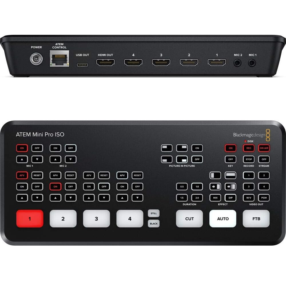 ATEM Mini Pro ISO si configura in un attimo ed è facile da usare. Offre 4 ingressi HDMI con conversione di standard, un’uscita webcam USB e un’uscita HDMI, un mixer audio Fairlight con EQ e dinamica, DVE per immagine nell’immagine, transizioni con effetti, chroma key per green screen, archivio per 20 fotogrammi per titoli, e ATEM Software Control.