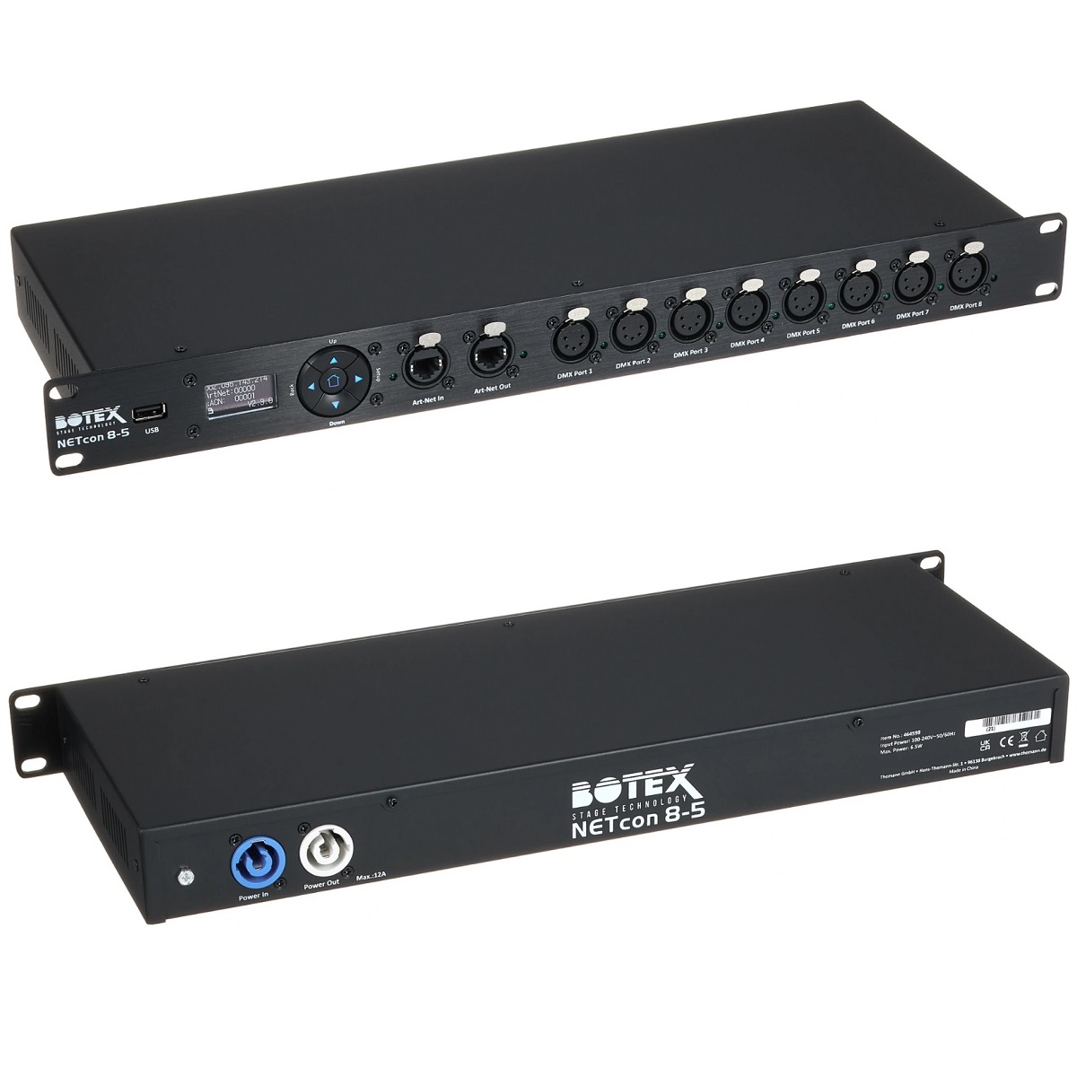 Il Botex NETcon 8-5 è un versatile convertitore ArtNet/DMX o viceversa, installabile su rack. Dispone di 2 collegamenti Ethernet RJ45 bloccabili e otto ingressi/uscite DMX. Compatibile anche con protocollo RDM, dispone di un ottimo display, di leds dello stato segnale e dmx, per 4096 canali dmx, 8 universi.