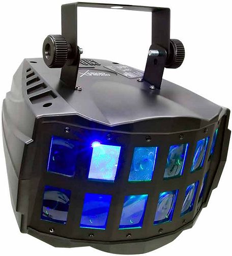 Luminosissimo grazie ai suoi 3 led da 3W (rosso, verde e blu). Copre un angolo di 132° con una miriade di fasci luminosi. E’ pilotabile da centralina DMX, incorpora infatti un’interfaccia a 2 canali. Può comunque funzionare anche indipendentemente con programmi automatici anche in master/slave. Può essere montato in verticale ad altre unità.