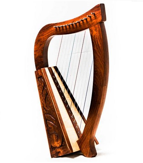 Arpa celtica in legno con 12 corde in nylon, con decorazione in stile “elfico”.
