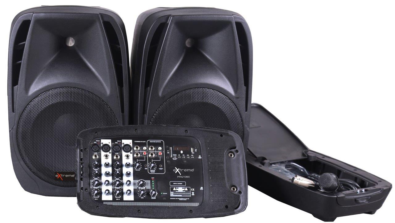 EXTREME PPA210MX COMBO CASSE+MIXER+REVERBERO+PLAYER BLUETOOTH USB SD+MICROFONO+3 CAVI / BUNDLE SISTEMA PA PORTATILE COMPATTO 200W 4 IN XLR 2 CANALI STEREO