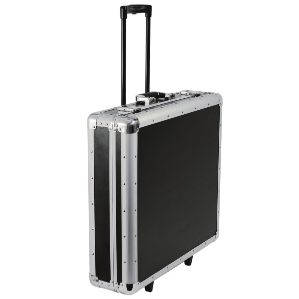 Trolley professionale per il trasporto di 200 CD suddivisi in 4 compartimenti e con top rimovibile. Colore nero.