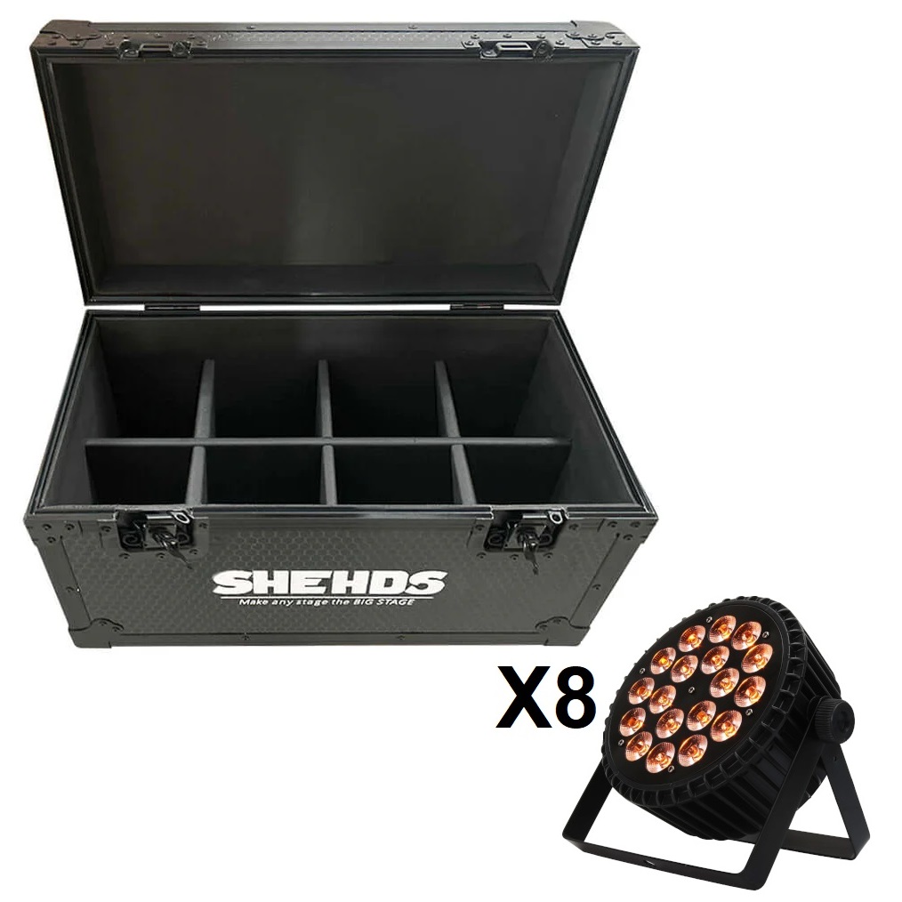 SHEHDS LED PAR 18×18 BUNDLE 8 PARLED DA 324W / 18 x 18W 6-IN-1 RGBWA-UV CONTROLLO DMX 6/10 CANALI + CASE
