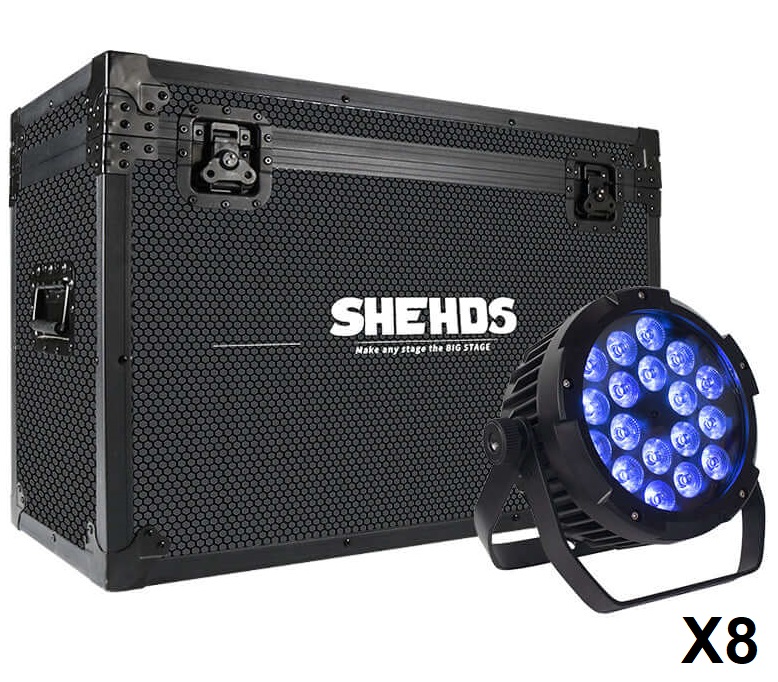SHEHDS LED PAR 18x18W IP65 BUNDLE 8 PARLED 324W 6-IN-1 RGBWA-UV DMX + CASE