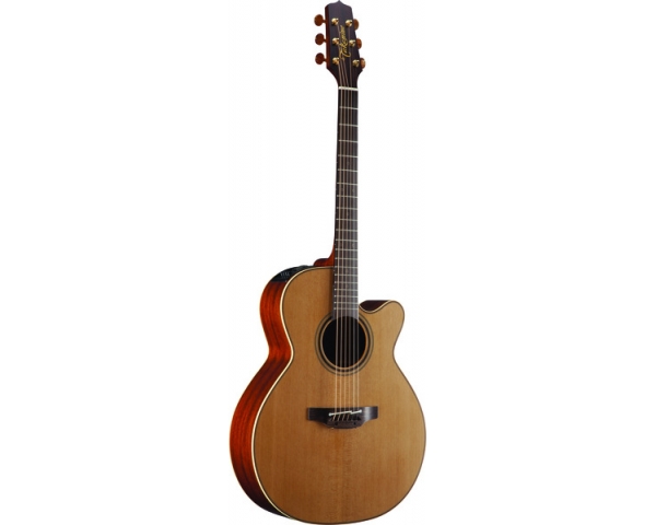 TAKAMINE PRO SERIES JAPAN chitarra acustica elettrificata nex spalla mancante. Tavola in cedro massello, fondo in sapele massello e fasce in sapele, manico in mogano, tastiera in palissandro, meccaniche dorate con bottoni ambra, preamplificatore CT4BII, finitura satinata.