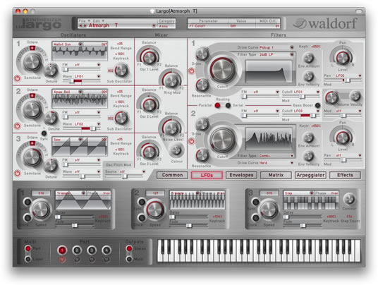 Il marchio Waldorf rappresenta da molti anni un importante punto di riferimento nel settore dei synth hardware e software. La tecnologia sviluppata dalla casa tedesca, in particolare per i synth della serie Q e per i potenti filtri ‘virtual analog’, ha un altissimo livello di innovazione ed è alla base di molti virtual instrument attualmente sul mercato, come HALion e The Grand della Steinberg. Il leggendario suono Waldorf all’interno di un synth virtuale: Waldorf Largo nasce dalla tecnologia utilizzata nelle linee Q e Blofeld, e vi mette a disposizione fino a 4 layer e 256 voci, 5 oscillatori (3 main e 2 sub), le wavetable dei famosi Microwave, Wave, Q e Blofeld, 2 drive stages per ciascuna voce, 2 filtri Multimode, 3 LFO, inviluppi ultra-veloci, un arpeggiatore a 16 step, ed effetti di prima qualità. Con Waldorf Largo ottenere dei suoni potenti e complessi è semplice, grazie ad un’interfaccia chiara e funzionale: oscillatori e filtri sono sempre bene in vista, e per accedere ai sub-moduli basta un clic. Caratteristiche generali • File Browser potente • Program Manager per riorganizzare in modo semplice il contenuto dei bank. • Fino a 256 voci per ogni istanza (dipende dalla CPU disponibile) • Fino a 4 layers per ogni suono • 4 uscite stereo (oppure 1 somma stereo) • Automazione di quasi tutti i parametri dall’host • Automazione dei parametri più importanti via MIDI CC